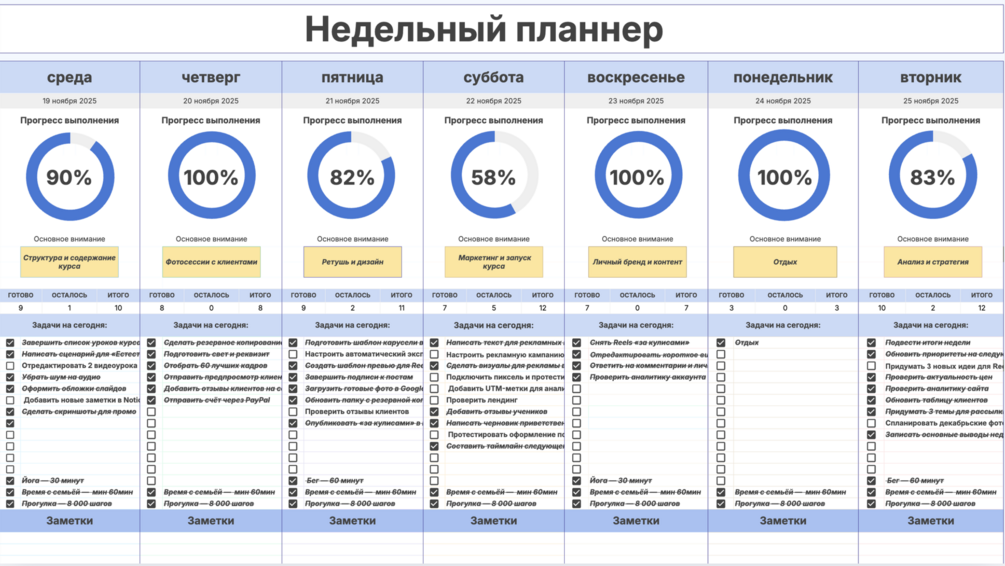 Этот минималистичный и мощный планер в Google Sheets поможет тебе структурировать неделю, сохранять стабильность и измерять то, что действительно важно.